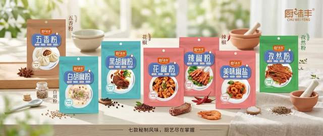 旗下调味粉包含五香粉、花椒粉、孜然粉、辣椒粉、白胡椒粉、黑胡椒粉、美味椒盐七大核心品类,无论是日常烹饪增香,还是特色风味调制,都能精准覆盖,无需多品牌叠加,降低经销商选品和库存压力。